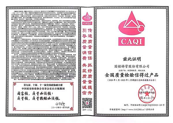 公司堅持以質(zhì)量為生命,以滿足用戶需求作為自己的追求,依靠雄厚的技術(shù)力量和先進(jìn)的生產(chǎn)、檢測設(shè)備,對生鐵、球墨鑄鐵管產(chǎn)品進(jìn)行全過程控制,產(chǎn)品質(zhì)量得到全面的保證